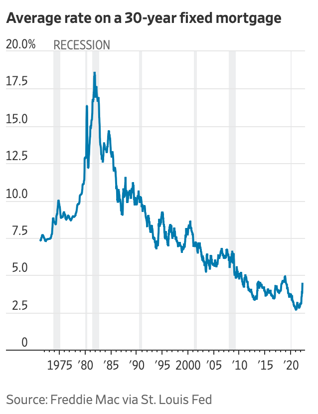 Of course, interest rates have been far higher in the past. Another article in today’s Wall Street Journal included a chart showing the average thirty-year mortgage rate over the past half-century:
