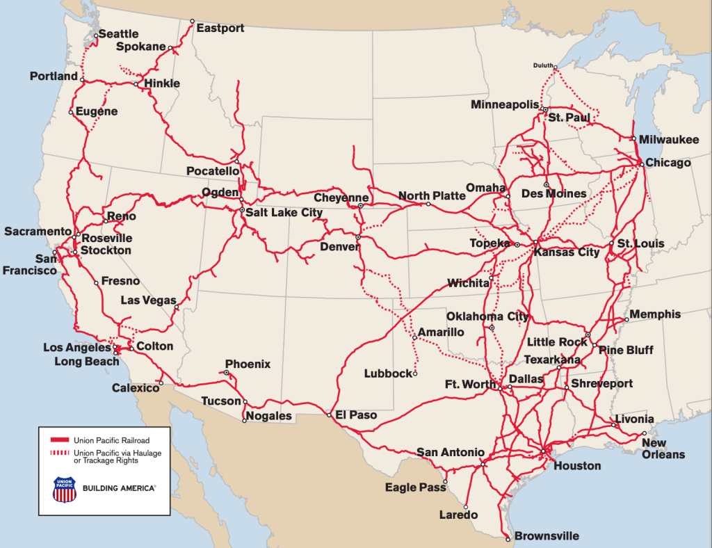 Union Pacific is a Class I railroad that serves the western two-thirds of the United States over a 32,452 mile network. The company was founded in 1862 when President Lincoln signed the Pacific Railway Act which provided incentives to build the first transcontinental railroad. The railroad industry has been consolidating for decades. Today’s Union Pacific is the product of numerous mergers.